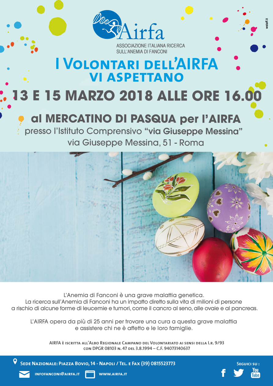 Vi aspettiamo al mercatino di Pasqua per l’Airfa che si svolgerà presso l’Istituto Comprensivo “via Giuseppe Messina” (via Giuseppe Messina, 51 – Roma) nei giorni 13 e 15 marzo 2018 alle ore 16.00.