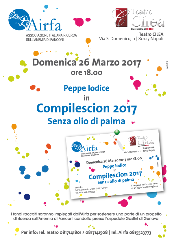 Il primo appuntamento è DOMENICA 26 MARZO 2016 ALLE ORE 18.00 al Teatro Cilea di Napoli con Peppe Iodice in”Complescion 2017 – Senza olio di Palma”. Con i fondi raccolti in occasione di questo spettacolo di beneficenza, finanzieremo una parte di un progetto di ricerca condotto presso l’ospedale Gaslini di Genova!