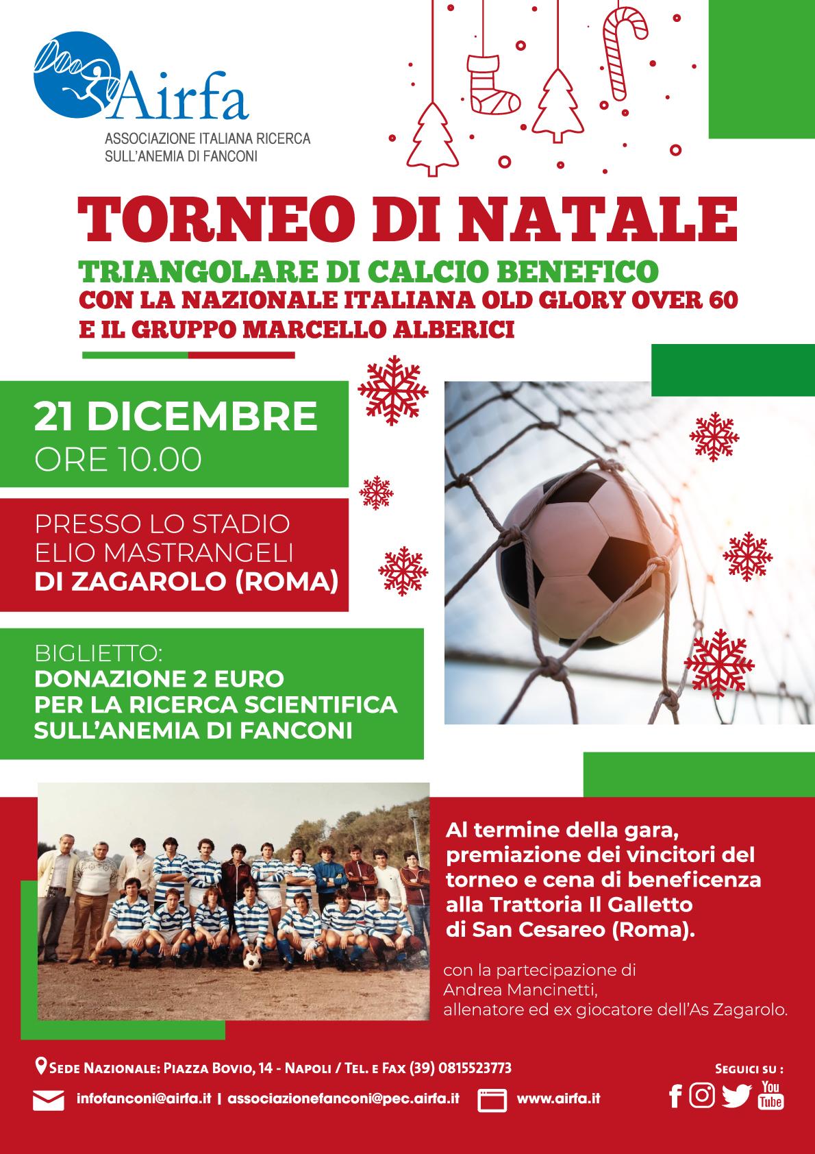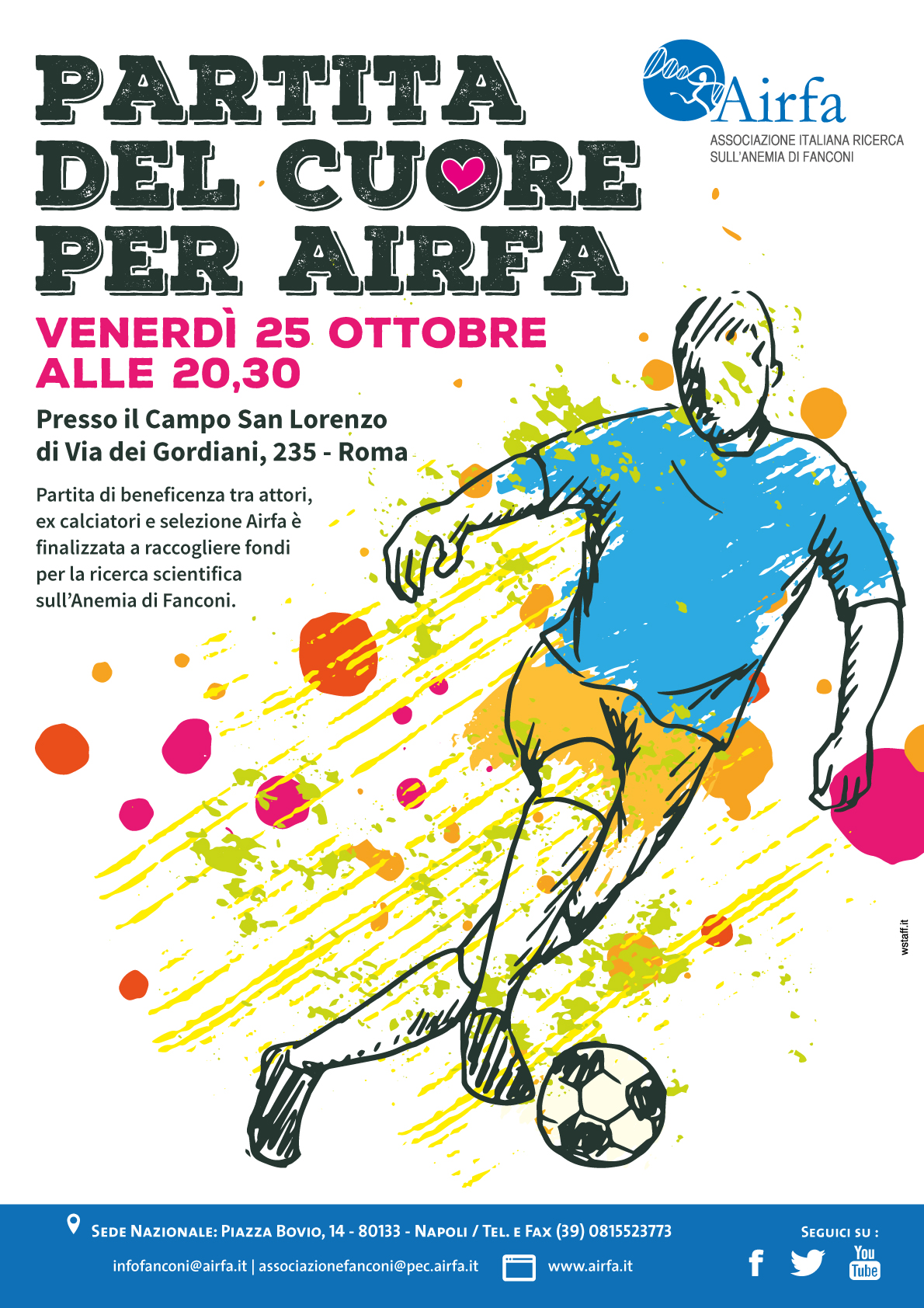 Venerdì 25 ottobre alle 20,30 al Campo San Lorenzo di Roma (in via dei Gordiani, 235) la selezione Airfa sfiderà attori e calciatori nella PARTITA DEL CUORE PER AIRFA
