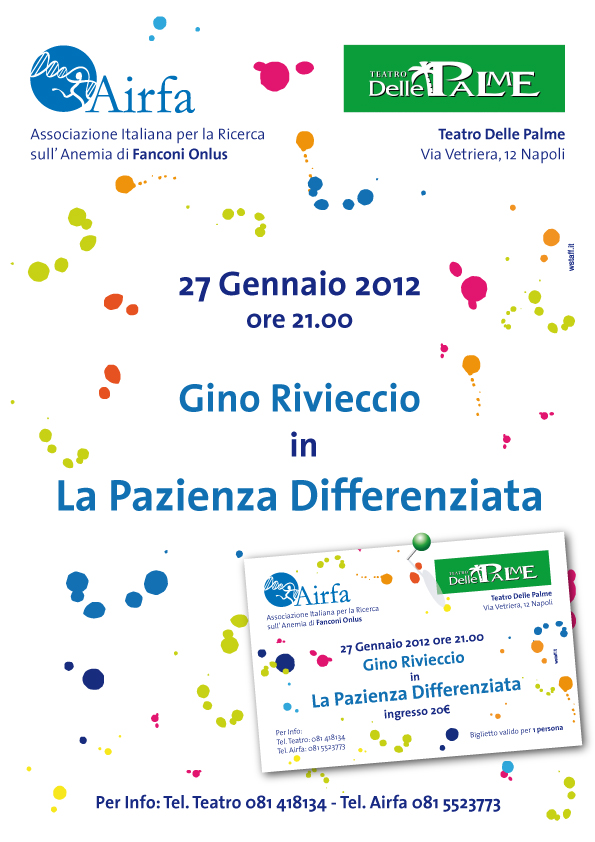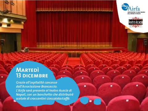Martedì 27 marzo dalle 16 alle 21 grazie all’ospitalità concessa dall’Associazione Brancaccio, l’Airfa sarà presente al Teatro Acacia di Napoli con un banchetto, durante il quale distribuirà Uova di cioccolato di g. 400 al latte o fondente con sorpresa.