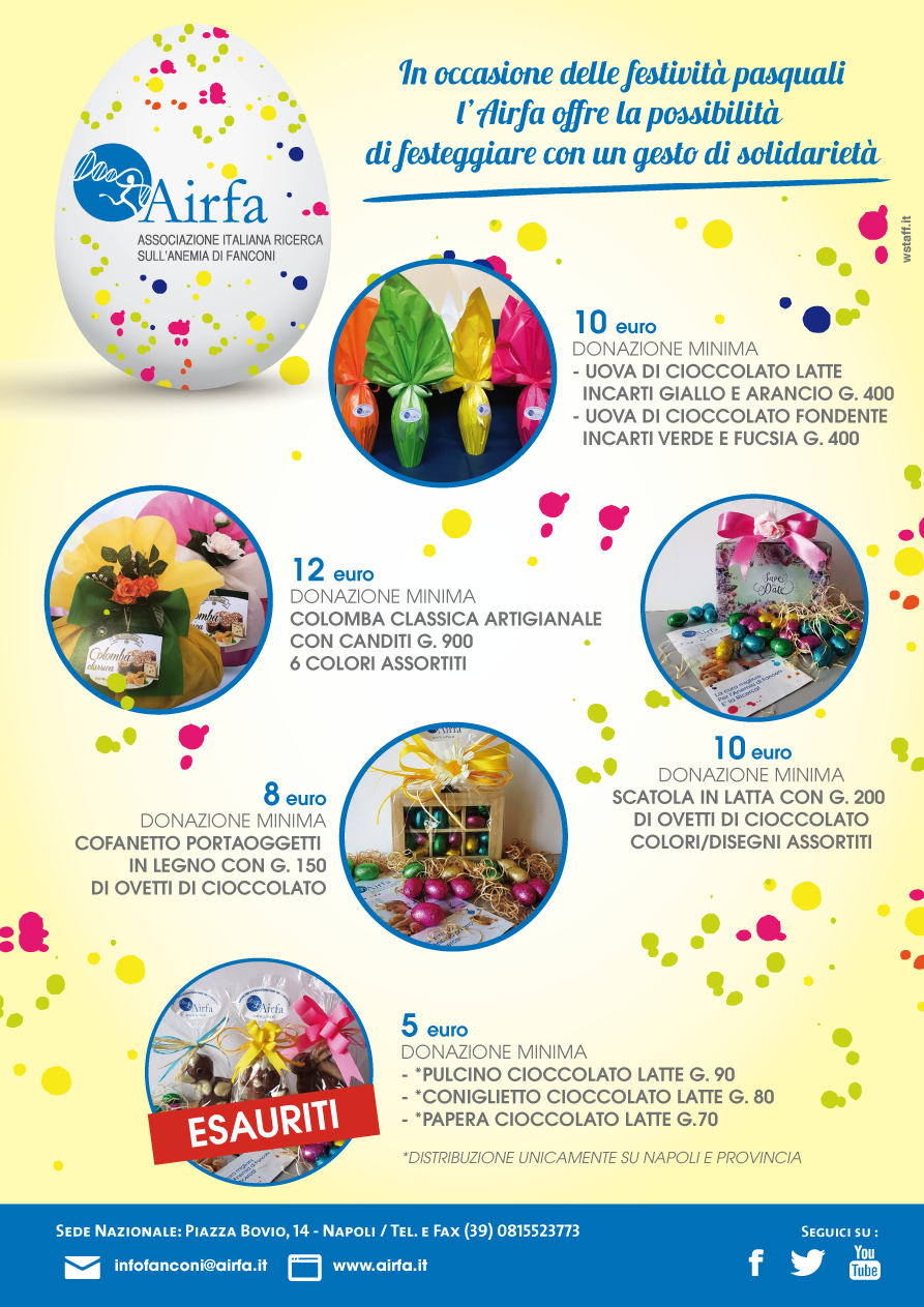 La Pasqua si sta avvicinando! Scegliendo un prodotto AIRFA da regalare ai tuoi cari per una Pasqua solidale contribuirai alla Ricerca Scientifica sull’Anemia di Fanconi!