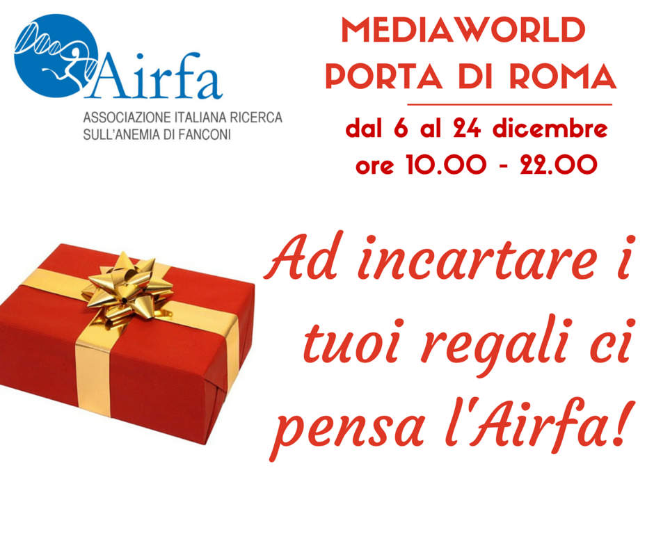 Da questo week end fino a Natale troverai i volontari AIRFA presso il negozio Mediaworld del Centro Commerciale Porta di Roma ad incartare i regali in cambio di una donazione per i nostri progetti di ricerca sull’Anemia di Fanconi. Vi aspettiamo!