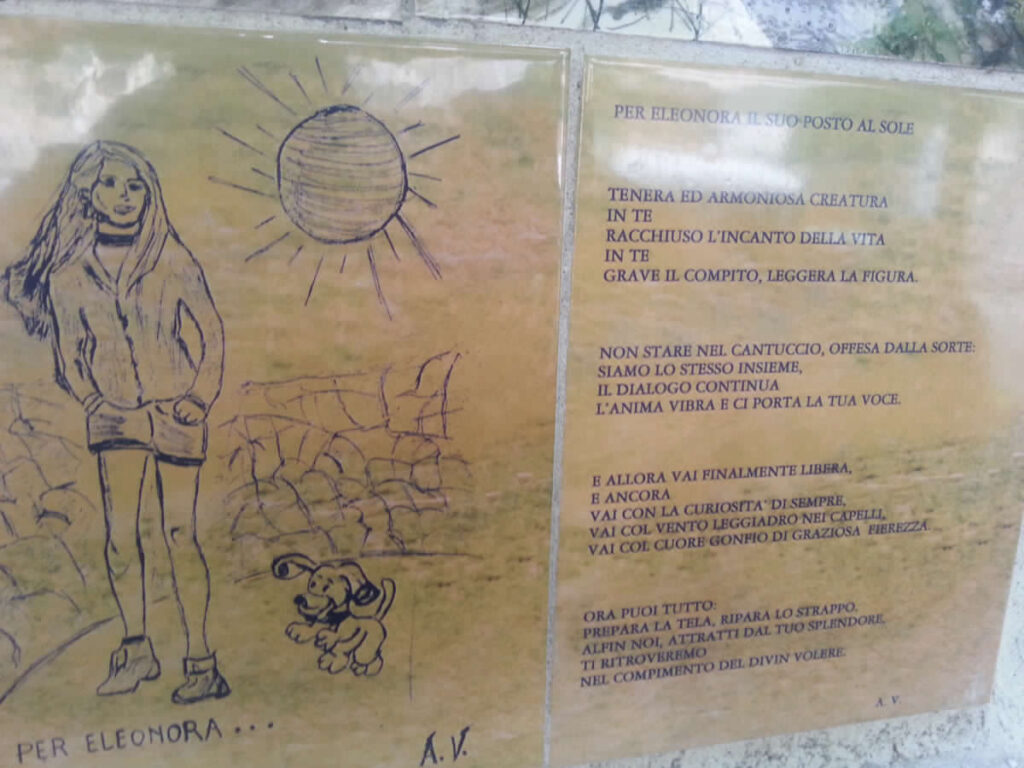 Dedicato ad Eleonora, che da tre anni non è più con noi. Nell’immagine piastrelle in ceramica, con un disegno ed una poesia, dedicati ad Eleonora ed esposte in un muretto