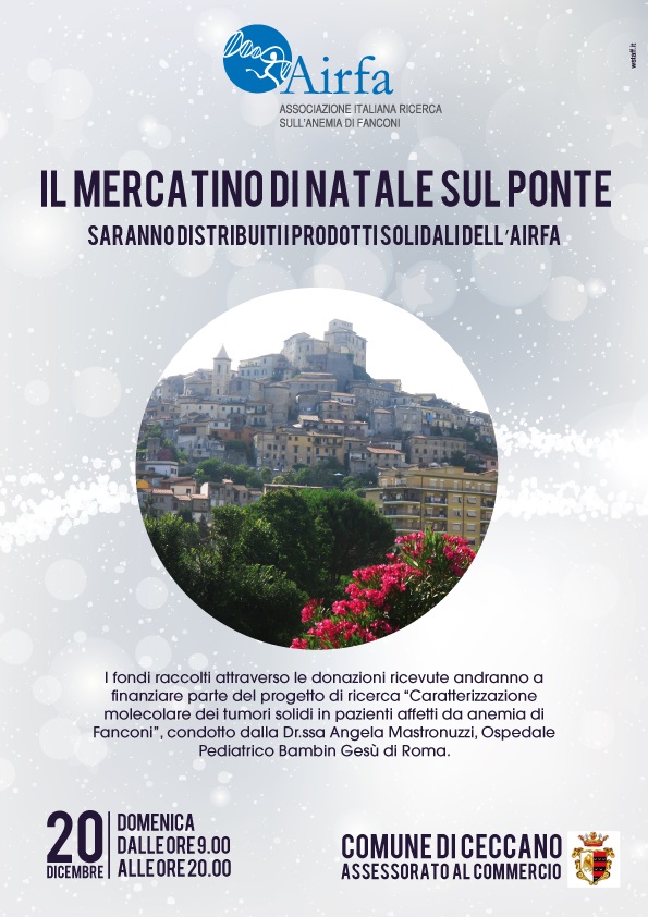 Domenica 20 dicembre, dalle 9 alle 20, i volontari dell’AIRFA saranno a Ceccano per distribuire i prodotti natalizi in occasione del “Mercatino di Natale sul Ponte”. L’evento è organizzato dall’Assessorato al Commercio del Comune di Ceccano.