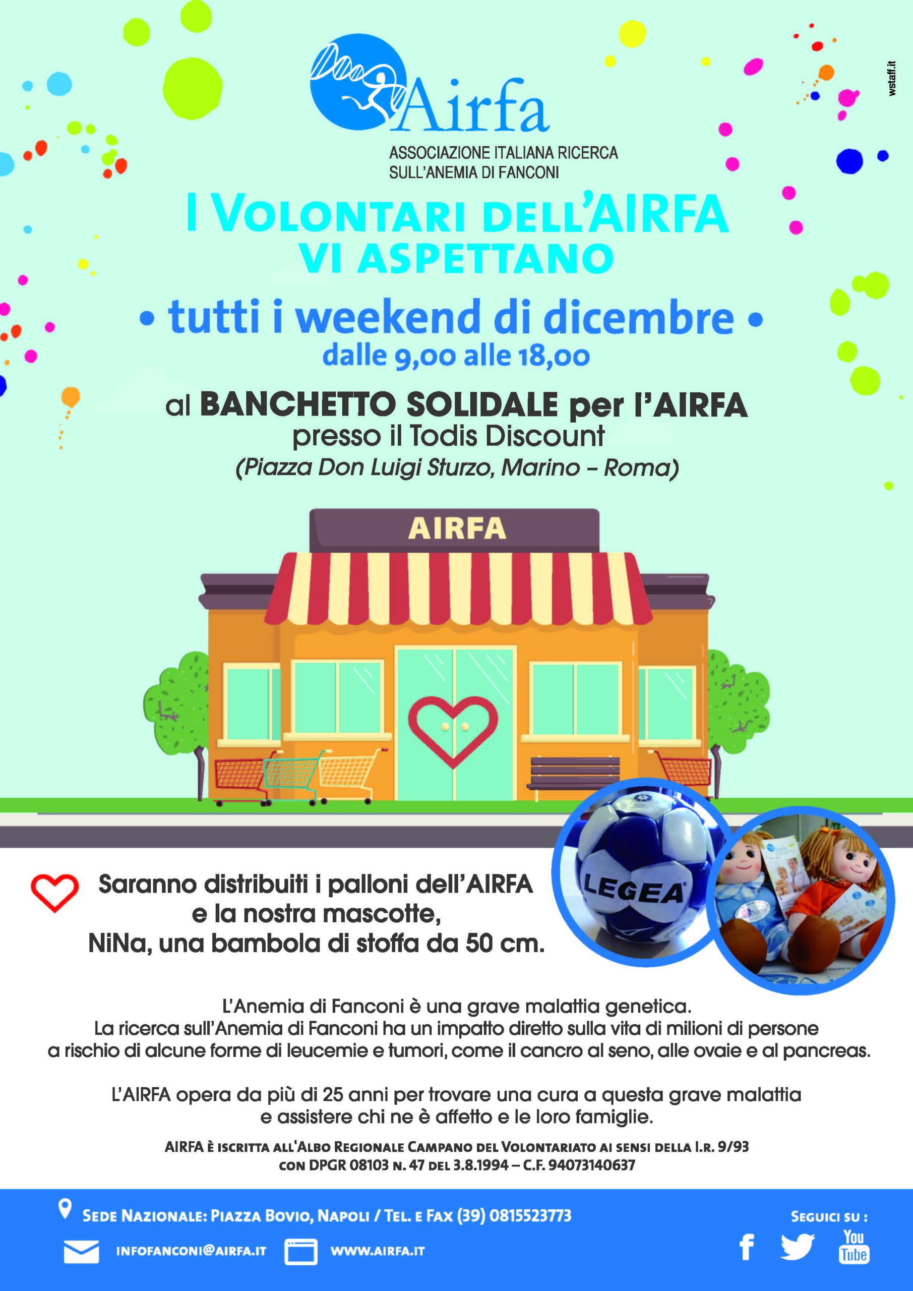 Tutti i weekend di dicembre, dalle 9 alle 18, presso il Todis Discount (piazza don Luigi Sturzo, Marino – Roma), i nostri volontari distribuiranno i palloni AIRFA e la nostra mascotte, NiNa, una bambola di stoffa da 50 cm.